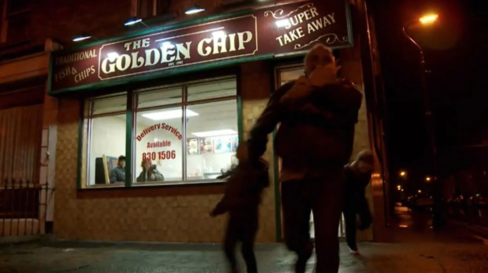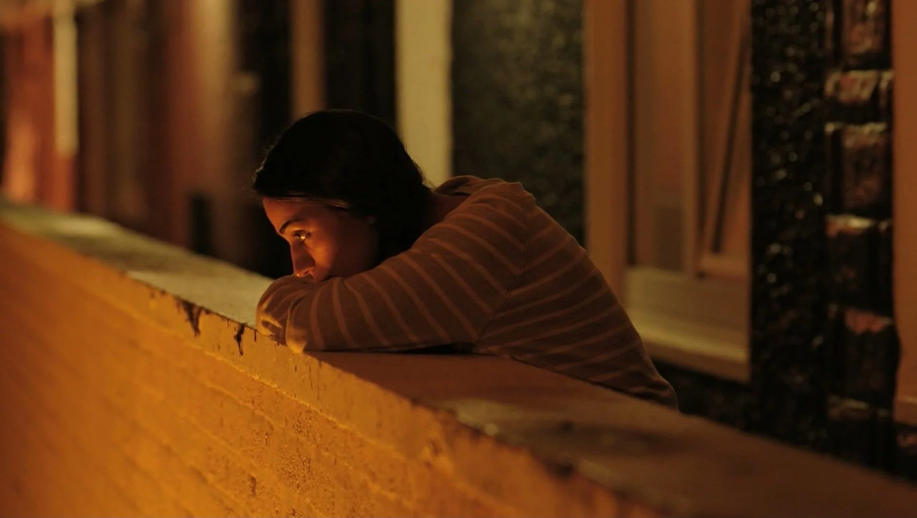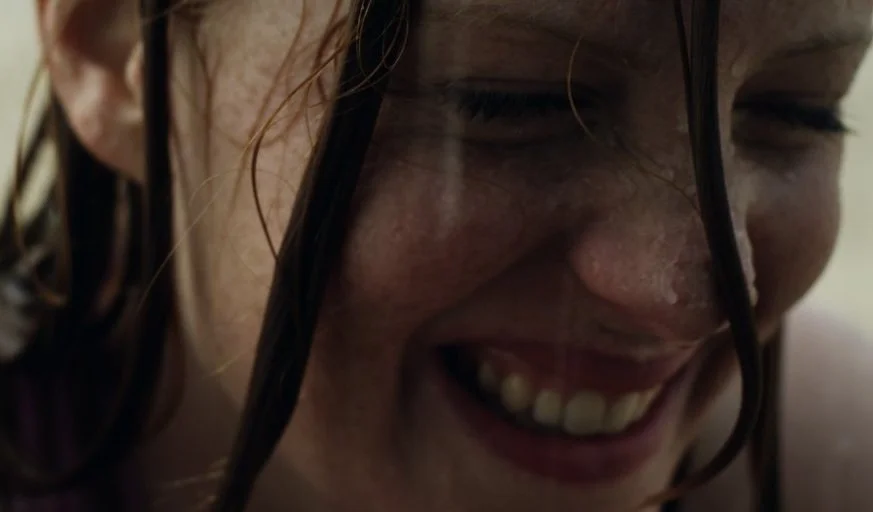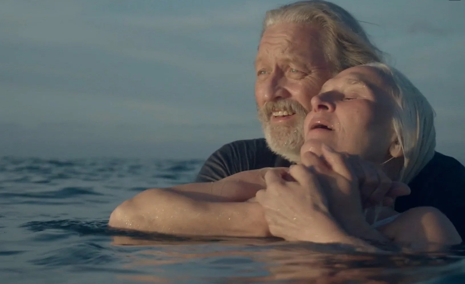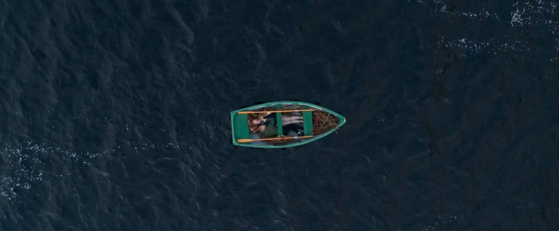 Image from above of a green row boat at sea with 2 people lying down side-by-side inside it.